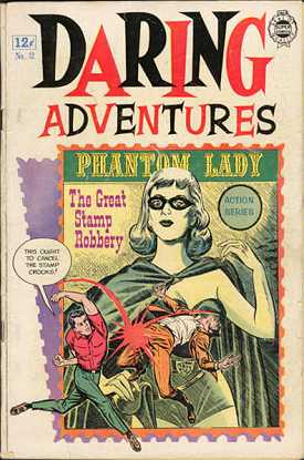 "This ought to cancel the stamp crooks!" jokes the man in the red shirt as he punches the thief into unconsciousness, while the Phantom Lady looks on bemused. -Daring Adventure Comics # 12 cover- |